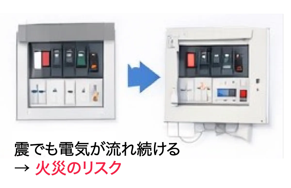 大きな地震のあとに起きる火災の多くは、「通電火災」と呼ばれる電気が原因の火災です。 揺れで поврежした配線や倒れた家電に再び電気が流れることで、ショートや発熱が起こり、火災につながるケースがあります。 耐震分電盤は、地震時に自動で電気を遮断することで、こうした二次災害を防ぐ役割を果たします。