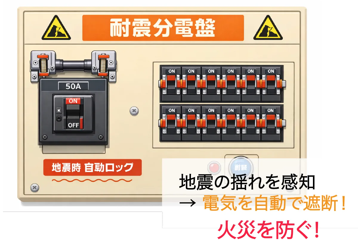 耐震分電盤とは、地震の揺れを感知すると自動で電気を止める機能を備えた分電盤です。 地震後の建物では、目に見えないところで配線が傷んでいることも多く、そのまま電気が流れ続けると火災の原因になることがあります。 耐震分電盤は、そうしたリスクを減らし、ご家庭の安全を守るための設備です。